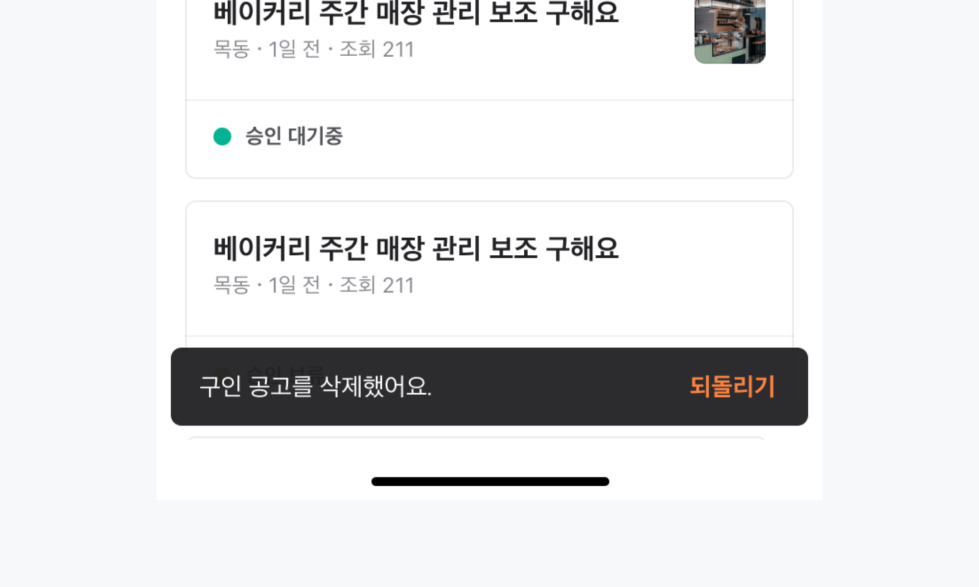 로딩실패, 삭제 등의 유저액션에 대한 피드백인 경우 재시도, 되돌리기 같은 간단한 액션버튼을 제공합니다.